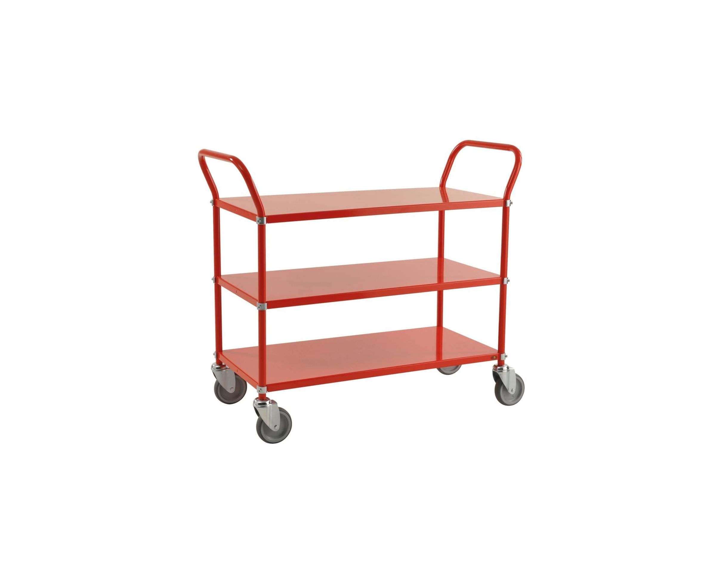 Värviline riiulite käru. Riiulid saab paigaldada servaga üles või servaga alla, riiulite vahekaugus fikseeritud. 4 pöörlevat ratast. Platvormi suurus 900 x 440 mm.