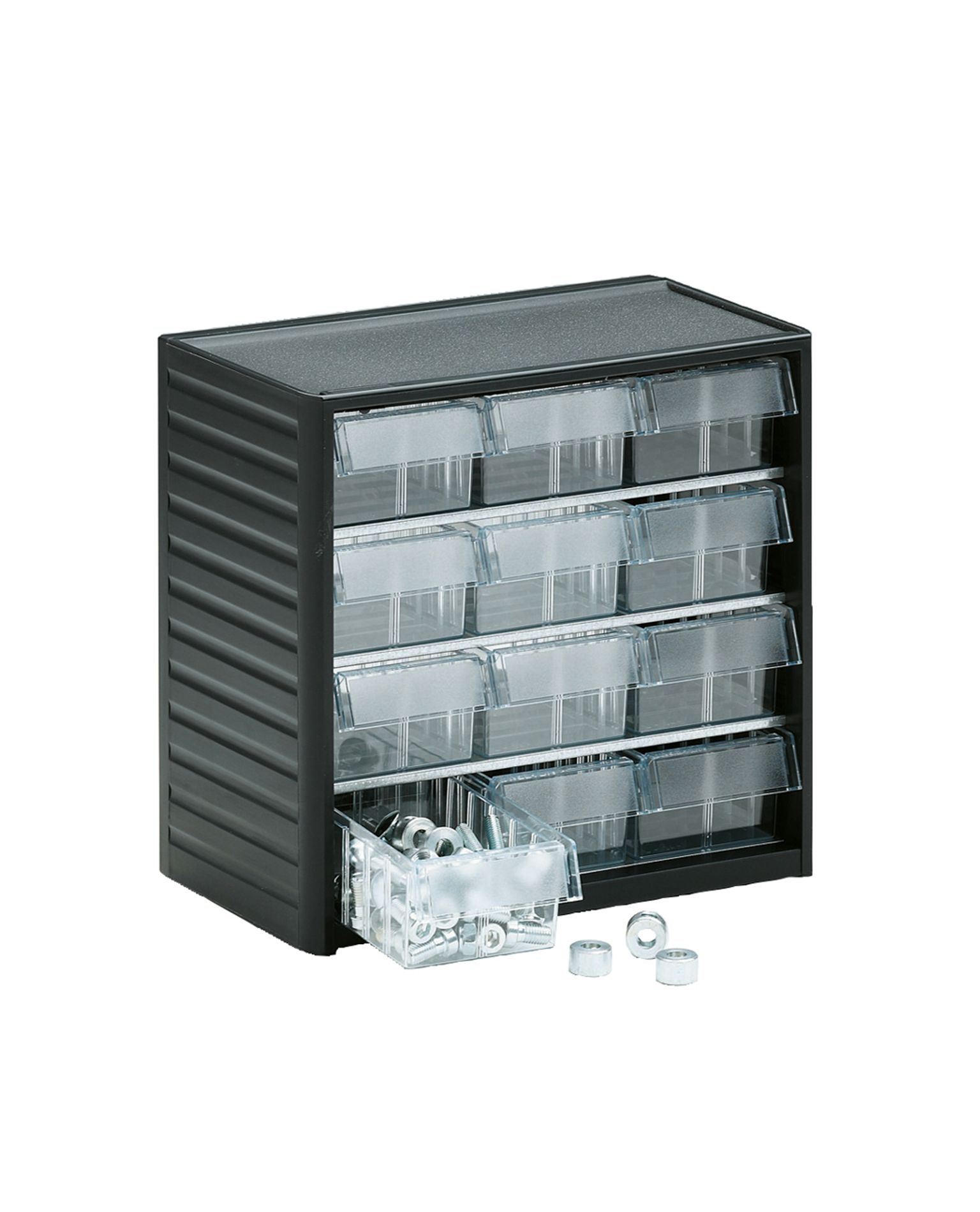 Kvaliteetsed kodumaised väikesed hoiukarbid professionaalseks kasutamiseks. Kastiriiulit saab hoida laual, kruvitud seinale, virnastatud pöörlevatele riiulitele või kastiriiulitele. Raam vormitud polüpropüleenist, riiulid tsingitud terasplekist, sahtlid läbipaistvast polüstüreenist. Komplektis on seitse erinevat sahtliriiulit.