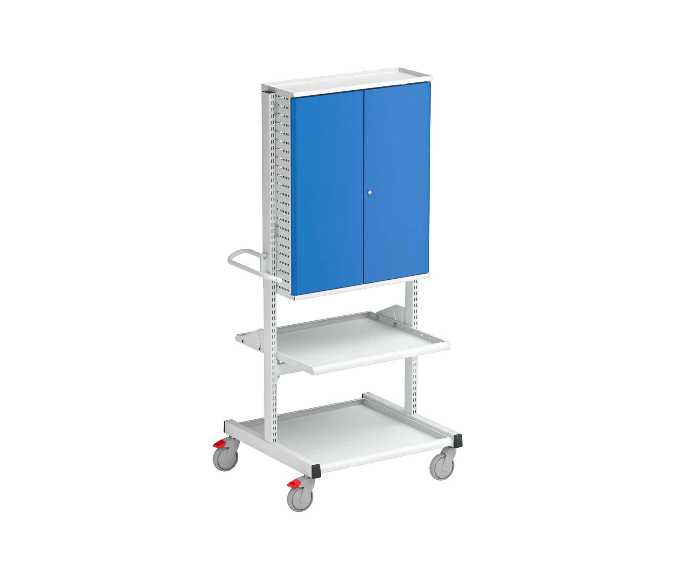 See ergonoomiline käepidemega teraskäru on modulaarne ja tänu laiale varustuse valikule saab seda kohandada vastavalt teie vajadustele. See on ideaalne näiteks LEAN-tootmiskeskkondade jaoks. Käru on hõlpsasti lükatav ja sobib hästi näiteks tööriistakäruks. Neli pöörlevat ratast (Ø 125 mm), millest kahel on pidurid. Pulbriga kaetud (RAL 7035). Koormus kokku 300 kg. Käru saab kasutada korjanduskastide, mitmesuguste riiulite ja augulaudade jaoks ning seda saab kasutada ka augulaudade kapi jaoks. Mõned kombinatsioonid on saadaval ka ESD-kaitsega.