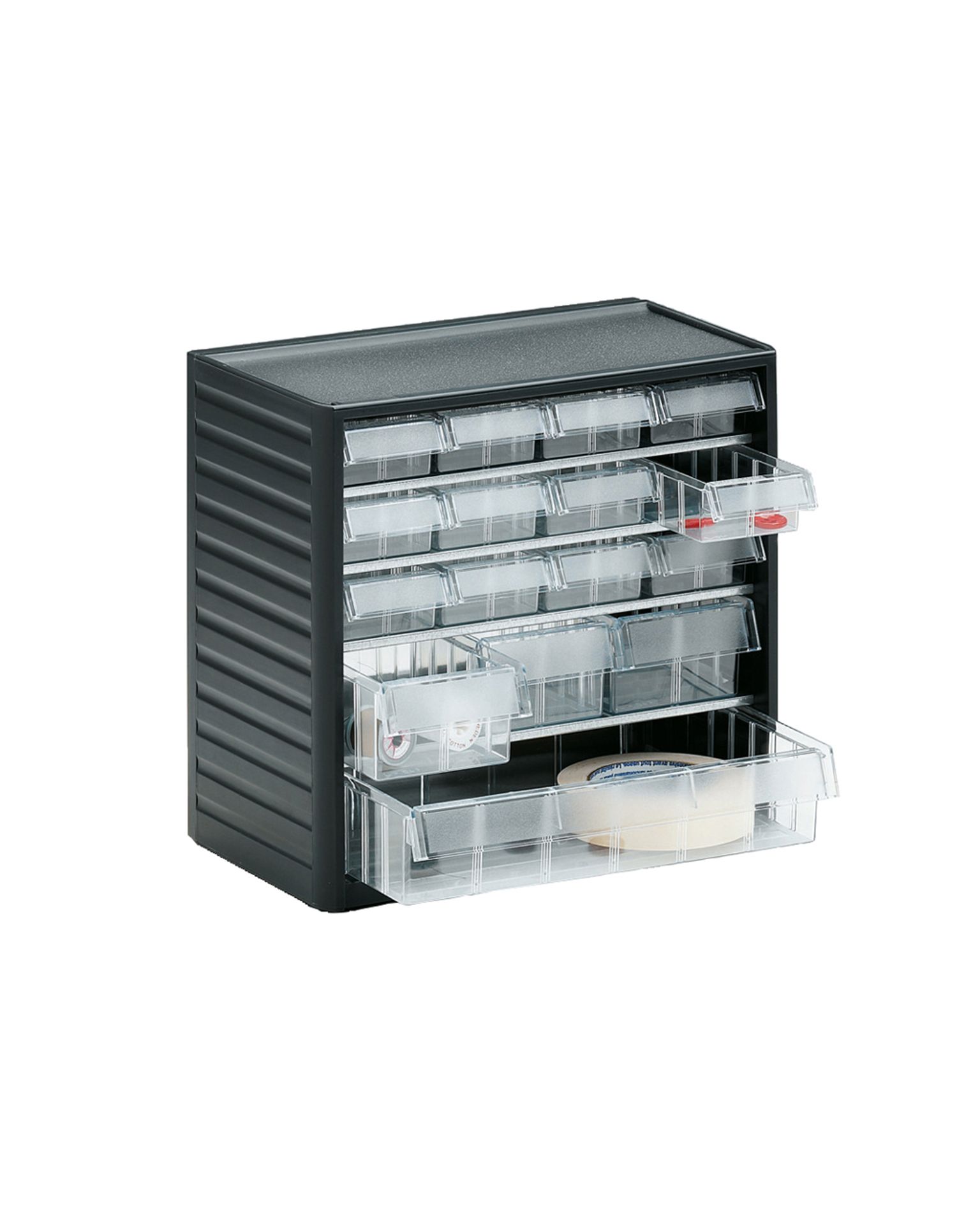 Kvaliteetsed kodumaised väikesed hoiukarbid professionaalseks kasutamiseks. Kastiriiulit saab hoida laual, kruvitud seinale, virnastatud pöörlevatele riiulitele või kastiriiulitele. Raam vormitud polüpropüleenist, riiulid tsingitud terasplekist, sahtlid läbipaistvast polüstüreenist. Komplektis on seitse erinevat sahtliriiulit.